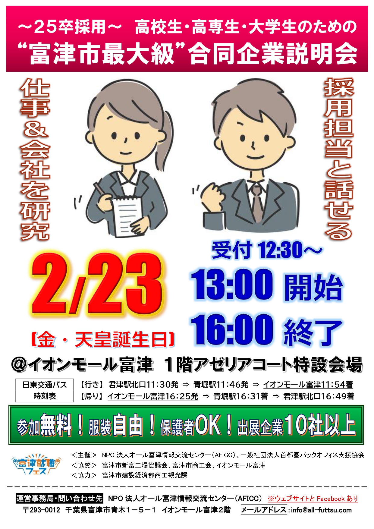 NPO 法人オール富津情報交流センター(AFICC)は、2025年(令和 7 年)卒業予定の高校生・高專生・大学生を対象とした”富津市最大級”合同企業説明会「富津就職フェス 」を、一般社団法人首都圏バックオフィス支援協会(所在地:千葉市美浜区)と共催いたします。